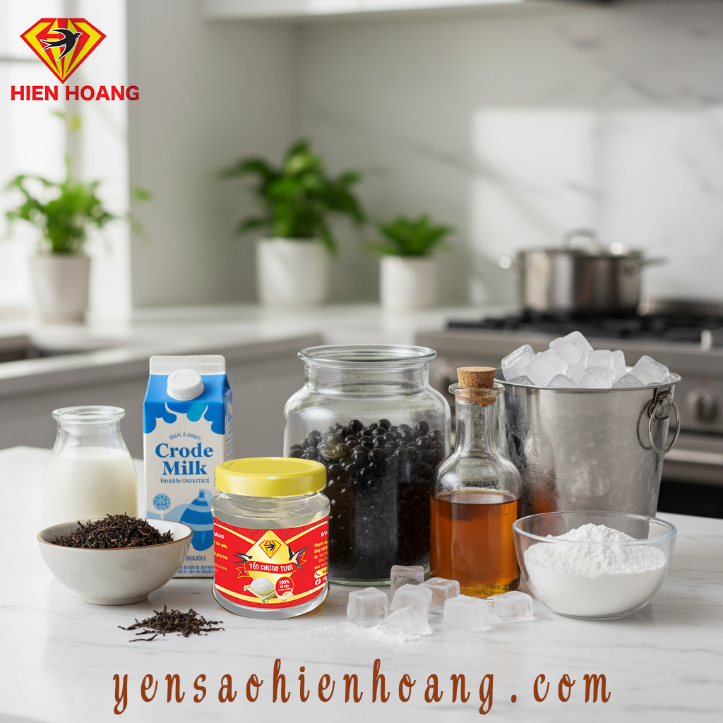 - Hoàn thành: Cho trân châu đã chuẩn bị vào ly. Thêm nước yến (hoặc súp yến). Rót phần trà sữa đã pha vào. Thêm đá viên và thưởng thức. Lưu ý: Bạn có thể điều chỉnh lượng yến và các thành phần khác tùy theo khẩu vị.